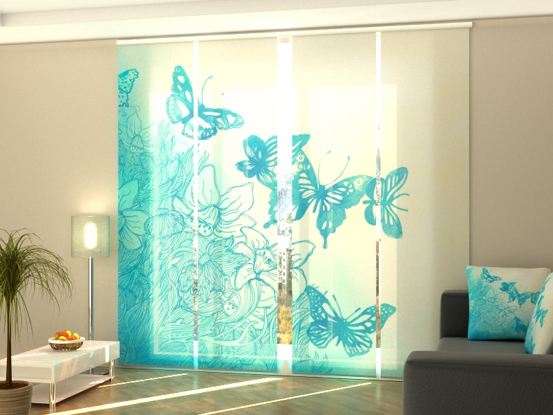 Set di 4 Tende a Pannello Acquerello Floreale Blu e Farfalle