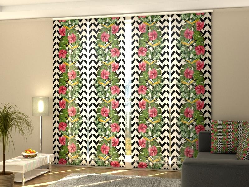 Set di 4 Tende a Pannello Foglie Tropicali e Fiori di Ibisco