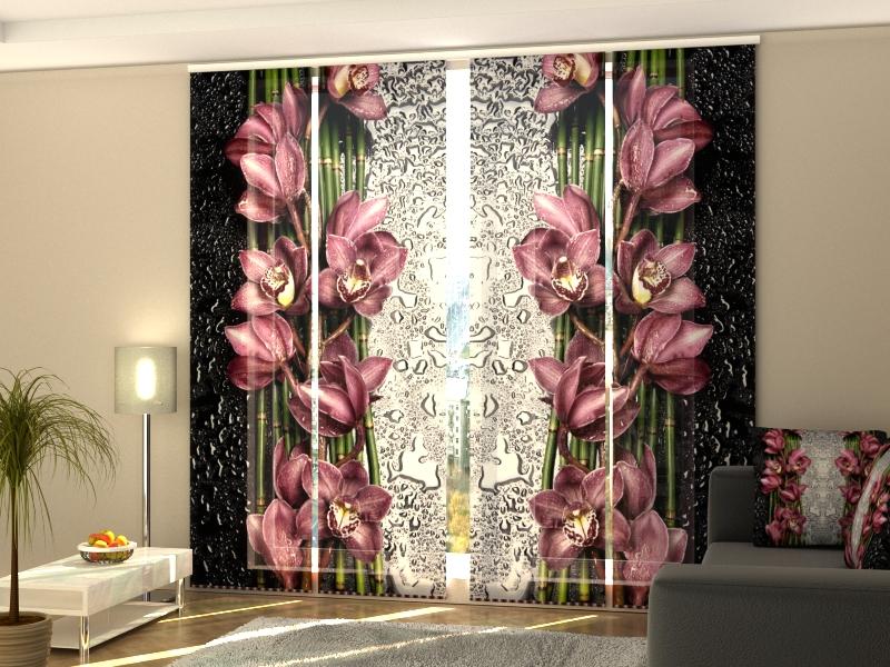 Set di Tende a Pannello in tessuto Screen "Orchidea Rosa con Bambù e Pietre".