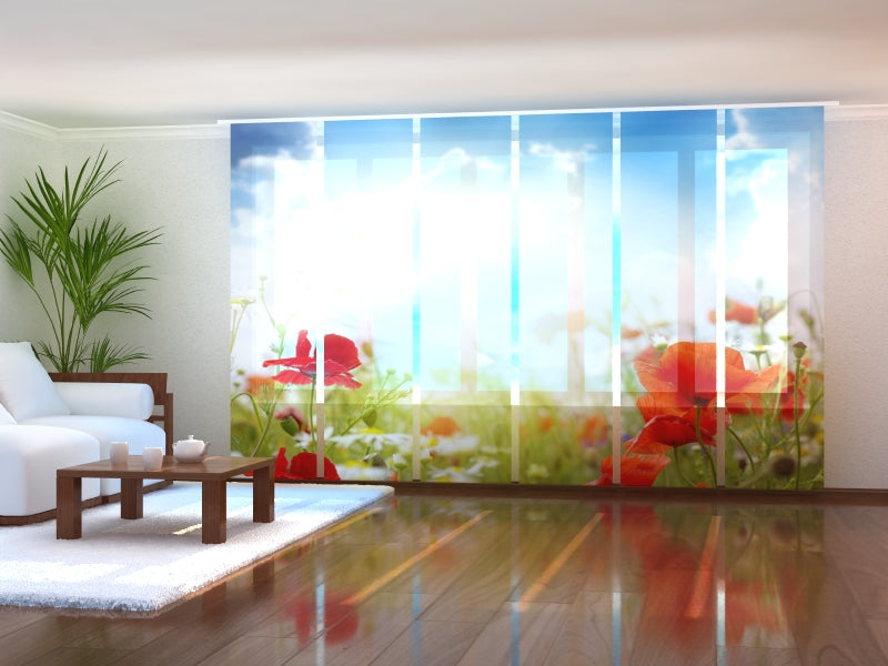 Set di 6 Tende a Pannello Papaveri Rossi e Cielo Blu