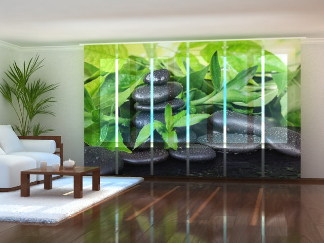Set di 6 Tende a Pannello Pietre di Basalto e Fogliame Verde