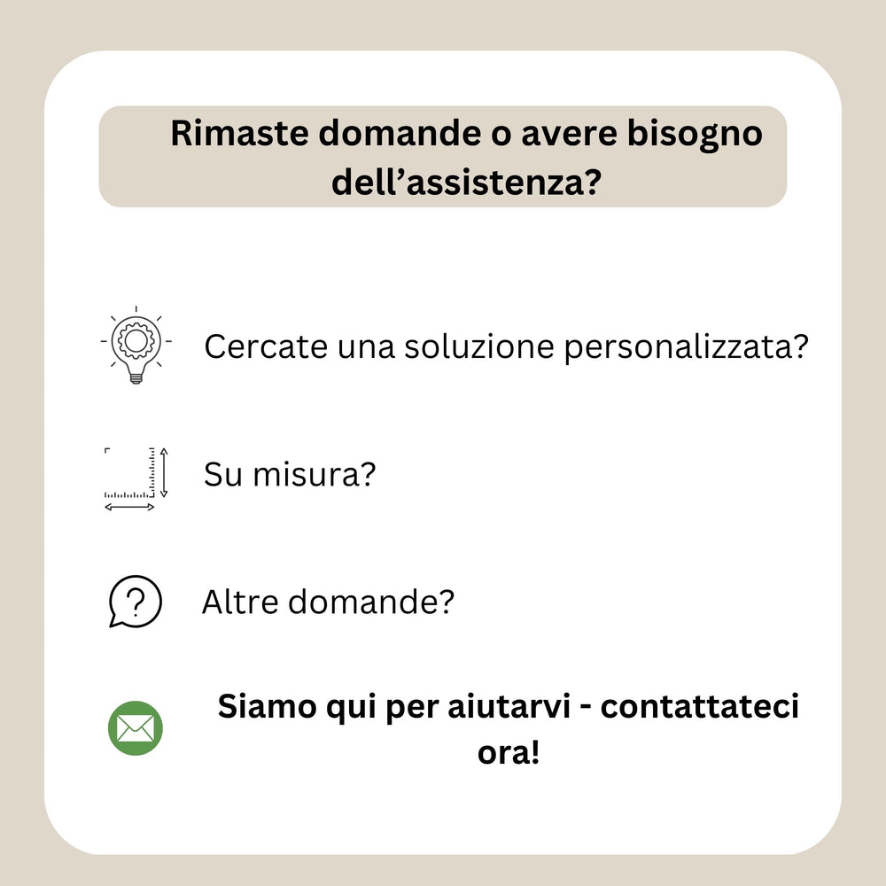 Tutti gli ordini Wellmira vengono prodotti internamente nella nostra fabbrica con la possibilità di realizzare qualsiasi dimensione su misura. Se avete bisogno di una dimensione personalizzata, vi invitiamo a contattarci utilizzando una delle seguenti modalità: