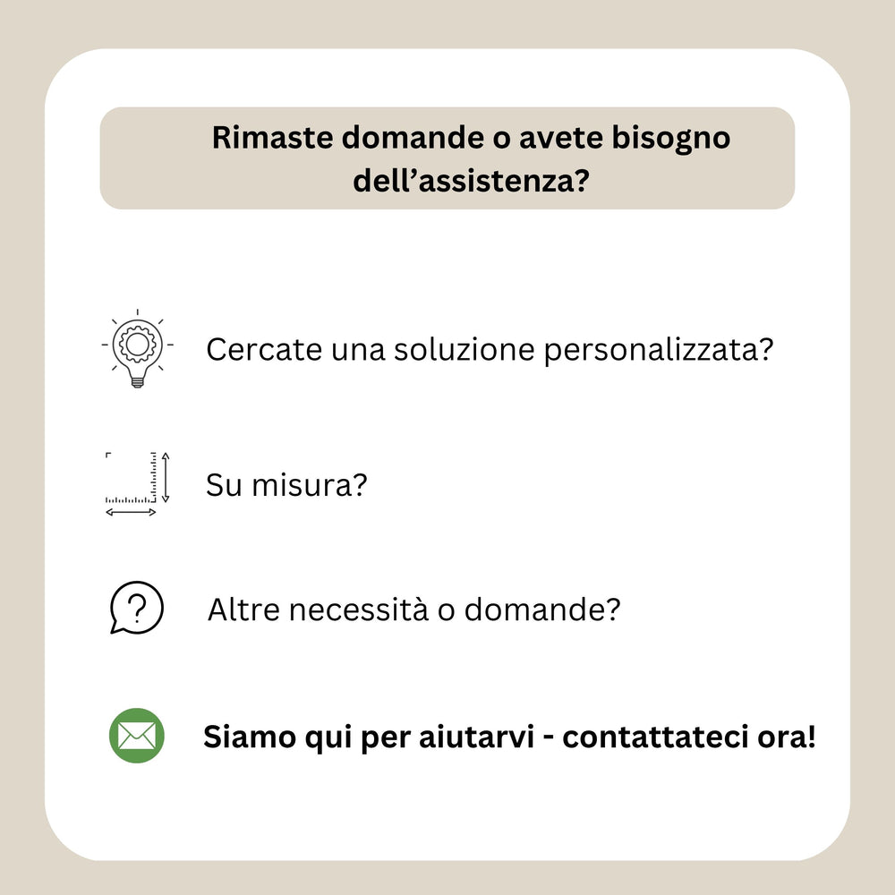 Tutti gli ordini Wellmira vengono prodotti internamente nella nostra fabbrica con la possibilità di realizzare qualsiasi dimensione su misura. Se avete bisogno di una dimensione personalizzata, vi invitiamo a contattarci utilizzando una delle seguenti modalità: