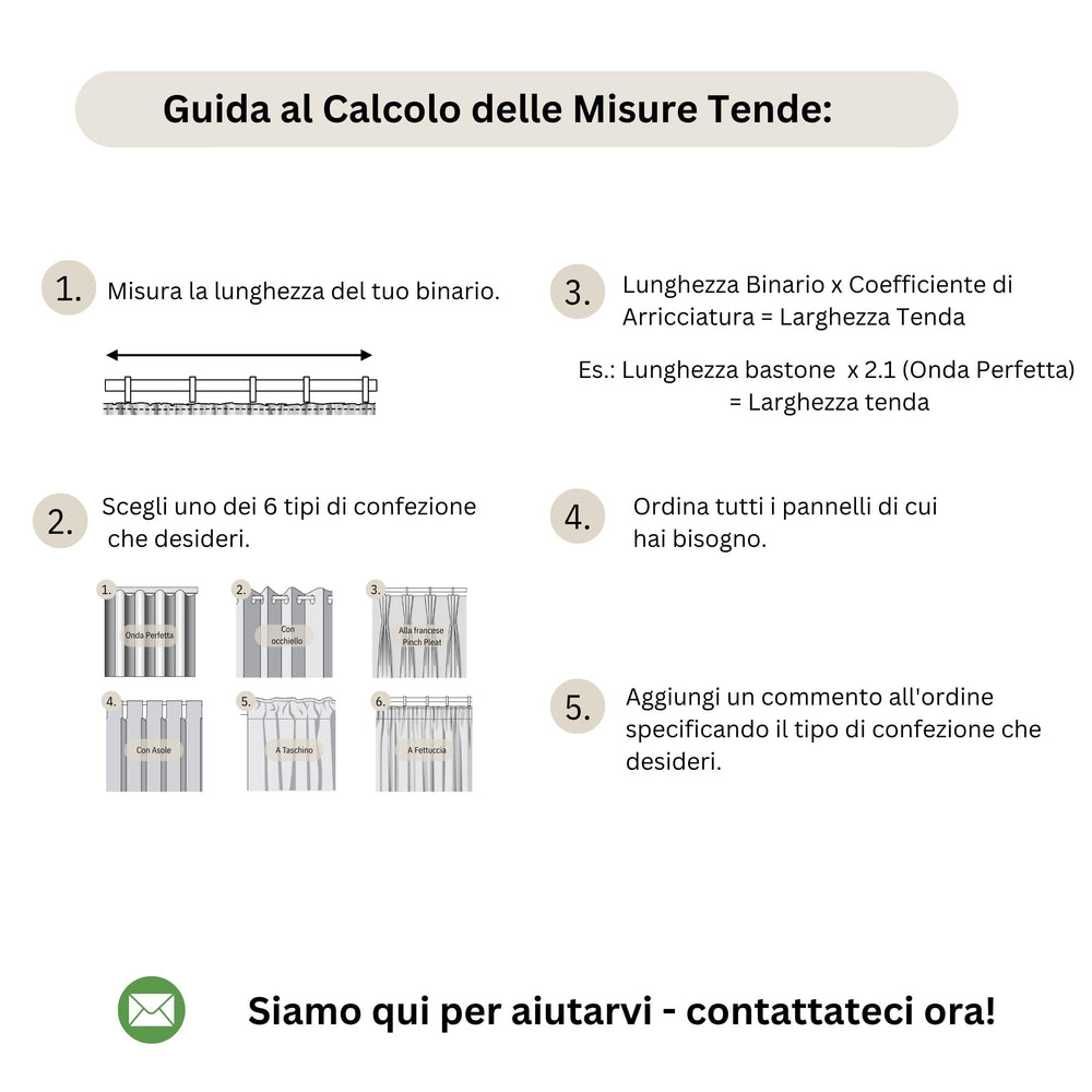 Crediamo nell'alta qualità in ogni dettaglio. Ogni pannello presenta un orlo appesantito per un drappeggio impeccabile. Il tessuto è sapientemente tessuto per una resistenza superiore e una maggiore durata. Le nostre tende trasparenti sono cucite in modo impeccabile, poiché è disponibile qualsiasi misura personalizzata. Se cerchi tende per soggiorno o una soluzione unica, le nostre tende su misura in voile e tulle sono la risposta: contattaci!